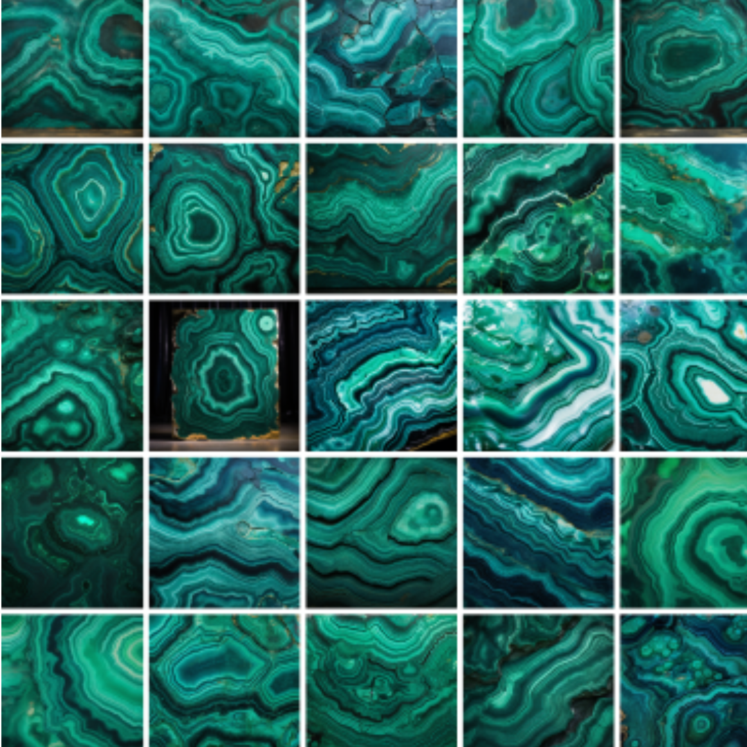 世界でひとつのオリジナル石模様、デジタルストーン生成サービスは、最新のAIテクノロジーで、多様なインクルージョンをもつ石模様を作成できます。たとえば、マラカイトひとつでこれだけの石模様。さらに特定の色を入れるなどのカスタマイズほか、パーソナライズなインテリアデザイン体験も提供します。